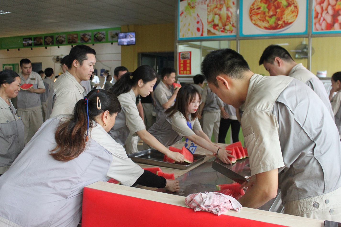 開餐時(shí)間到了,員工陸續(xù)來到餐廳,帶著一身暑氣,拿起西瓜咬了一口,從他們豆大汗珠的臉上,能感受到那份幸福與清涼。