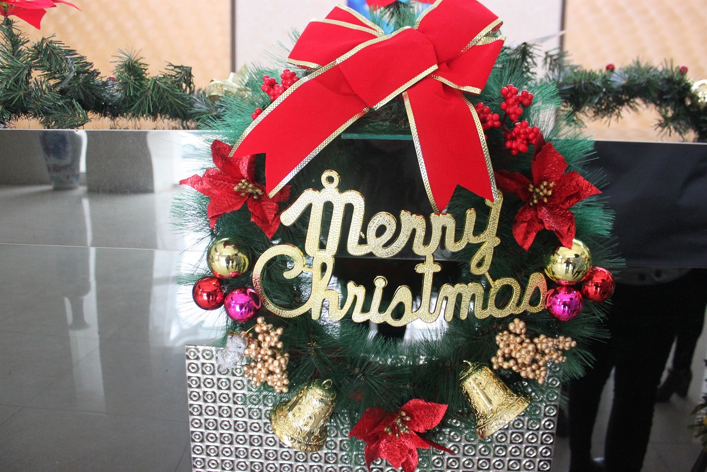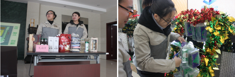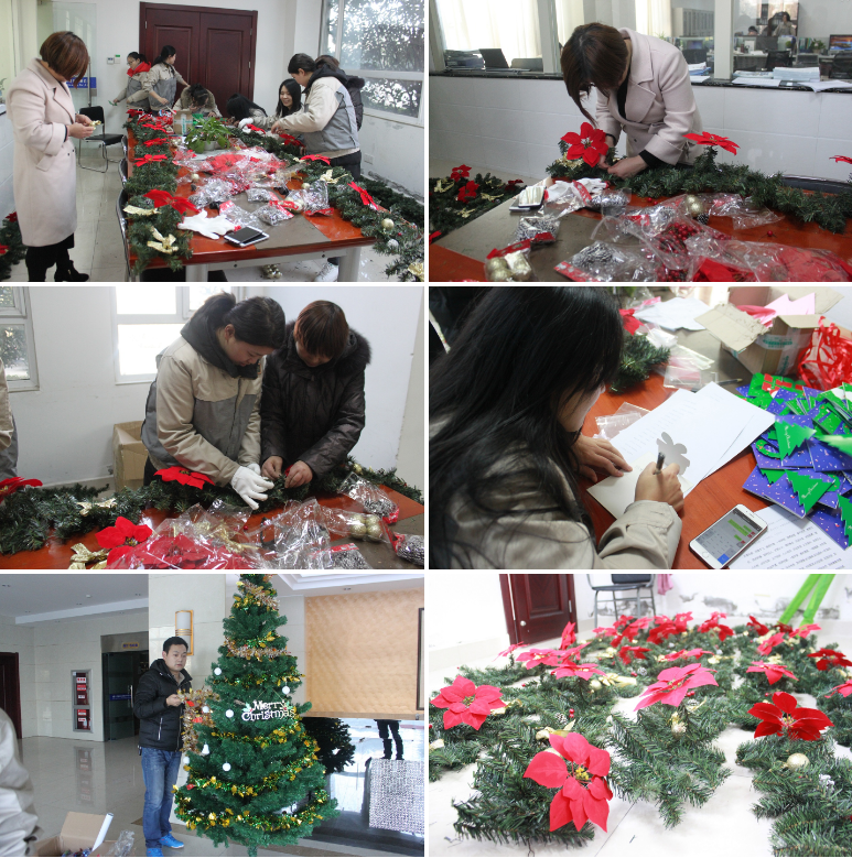 活動(dòng)現(xiàn)場設(shè)在行政大廳,經(jīng)過大家的努力,把大廳布置的非常漂亮,但前期的工作還是相當(dāng)大的,寫賀卡、組裝圣誕樹等,還搭配許多裝飾。